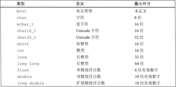 算术类型的尺寸(所占比特数)在不同机器上有所差别,下表列出C++标准规定的最小尺寸。